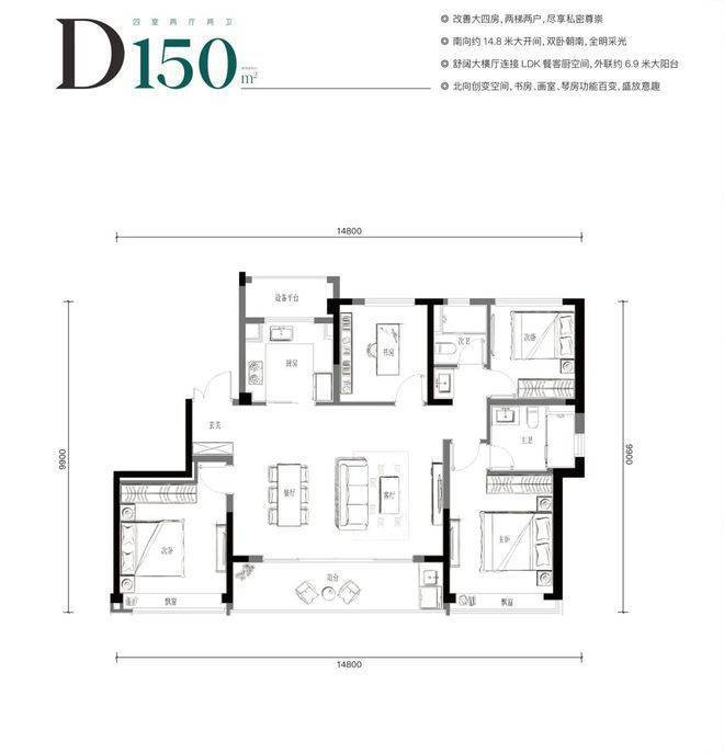 最大的约150㎡大四房,2梯2户,面宽做到了约14.8米,拥有霸气的约6.9米大横厅。