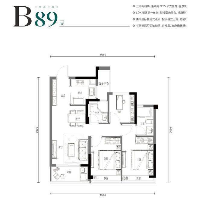 约89㎡是完整的三房两卫,做到三开间朝南+双飘窗,厨房能放下双开门冰箱。