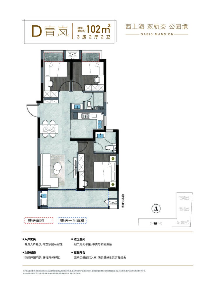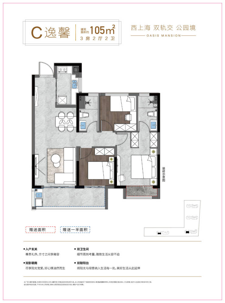 户型小而精,刚需友好 :85㎡两房实现双卧、双卫、独立厨房,106㎡三房餐客一体+阳台连通,空间利用率高,适合沪漂青年、新婚家庭。