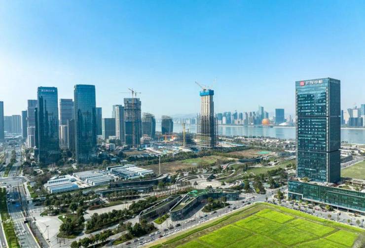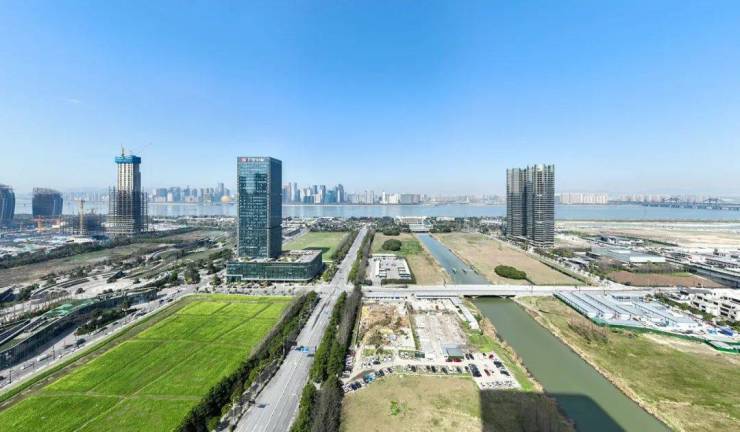 一路之隔水云间,东南面近瞰亚洲最大SKP(在建),南面坐揽亚运主场馆莲花碗、“奥体七星”,西望钱江新城地标群、江河汇,北览钱塘湾未来总部基地。
