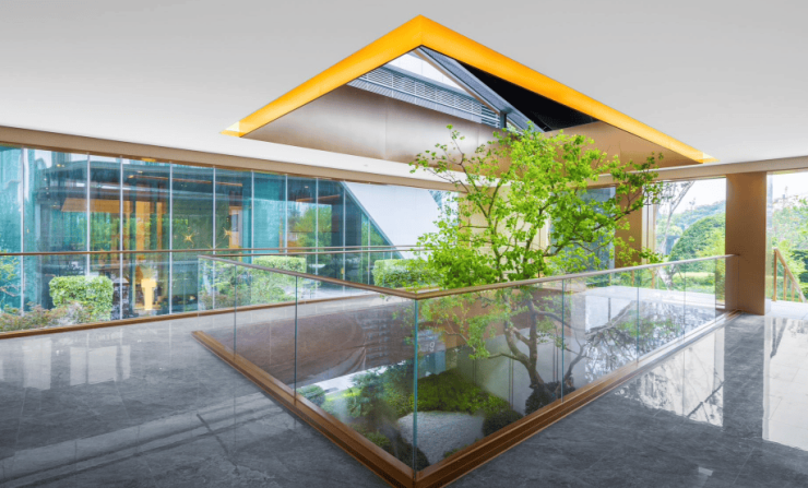 一般常规的商业设计不愿在景观上做太多设计。国泰中心大门口就大手笔布置了两棵树龄百年的罗汉松,每颗价值100多万,归家第一个视野豪气感拉满。