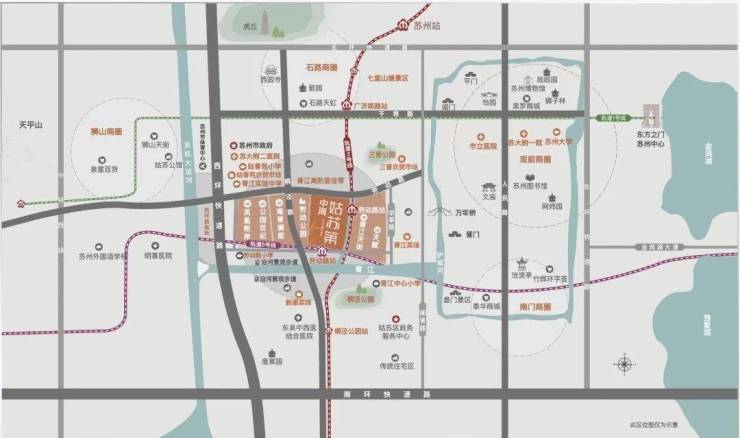 双轨TOD,紧邻地铁2号线(南北向)和5号线(东西向)(朴注:双轨交汇的新盘,在苏州很少很少),无缝对接1/3/4号线,将来5站路就可以到火车站,5站换乘到新区狮山,8站抵达园区湖西。贯穿苏州东西和南北量大动脉,方便触达全城,本项目也是内环稀缺的双轨站交汇的新盘项目。