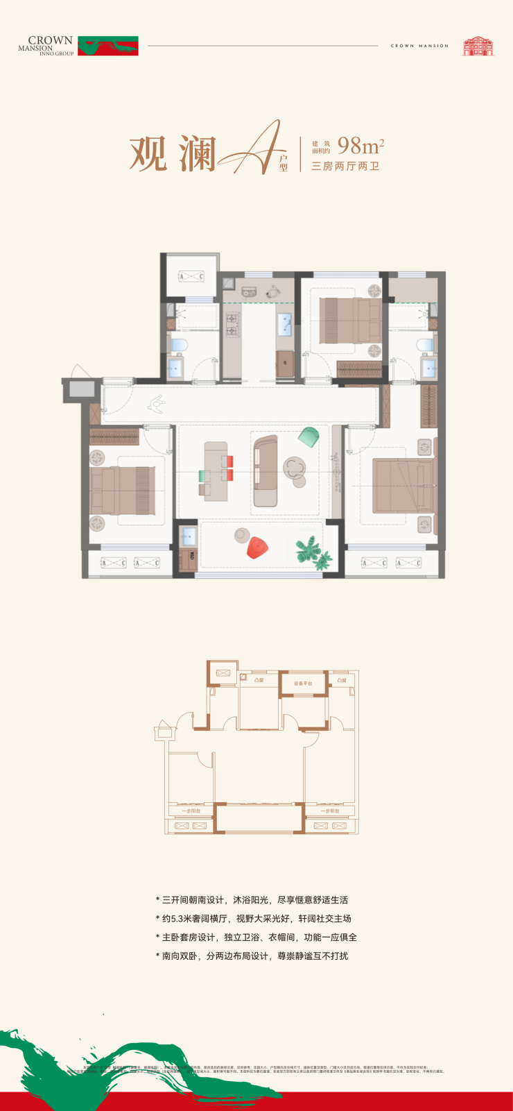 当前主推107㎡三房两卫户型,5.3米横厅+套房主卧设计,空间利用率高,适合三口之家或三代同堂;