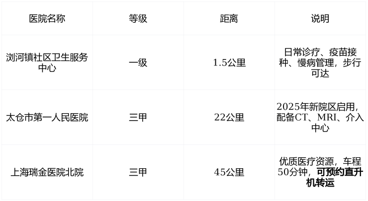 ✅ 小病不出镇,大病50分钟抵沪——医疗保障体系完整, 生活安心。