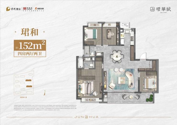 1. 户型设计:保利珺华赋项目涵盖152-222平米四种户型,从精致三房到宽敞四房,满足不同家庭的需求。户型方正,南北通透,采光充足,空间利用率高。