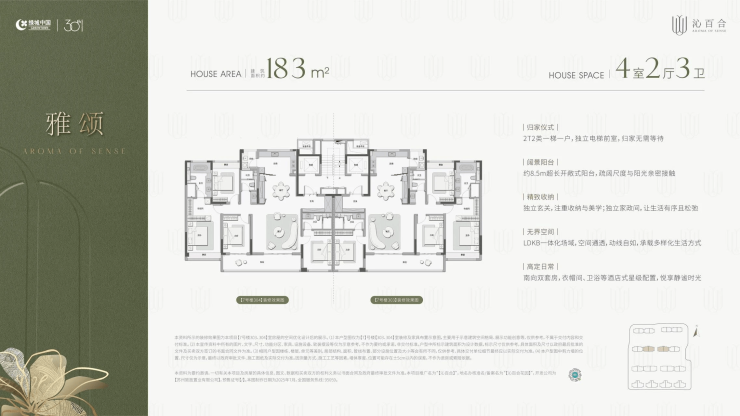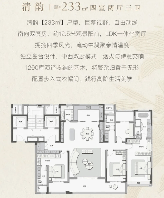 主力户型155–235㎡,全部为四房两厅三卫,次卧开间≥3米,客厅面宽最高达5.7米,南北双阳台+全明户型,满足三代同堂的实用需求,实现“空间平权”理念。