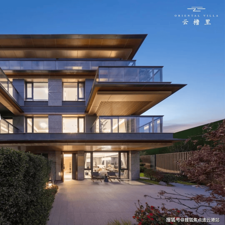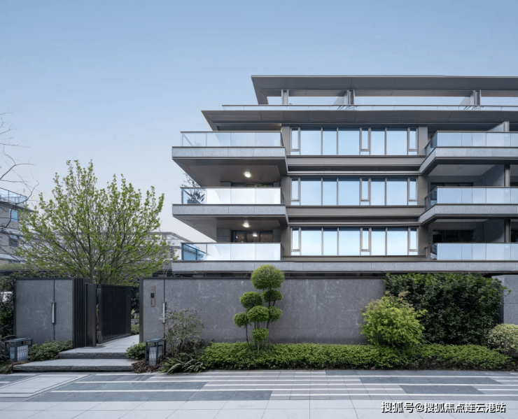 外立面采用石材干挂+铝板+大面积玻璃幕墙,屋顶挑檐设计融合宋风美学