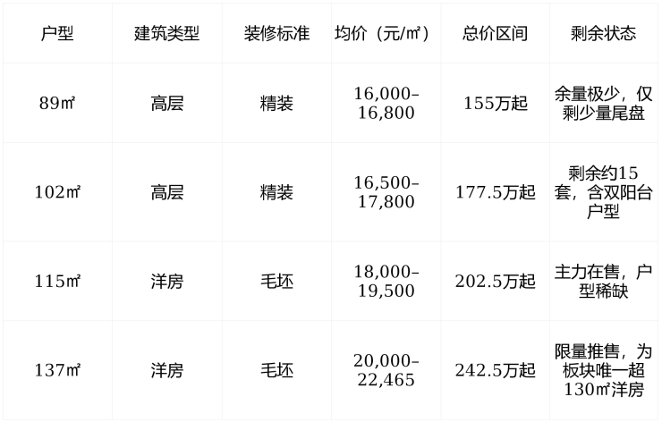 特别提示 :高层已基本售罄,当前主推为 115㎡、137㎡毛坯洋房 ,适合追求空间自由度与长期居住品质的家庭
