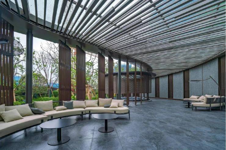 外立面融合“粉墙黛瓦+金属线条”新苏式风格