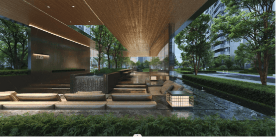 建筑西立面和阳台上方檐口用木纹铝板勾勒出古城屋檐的轻盈剪影,在复刻的「披檐」形制与花窗纹格里,触摸到传统与现代的共生密码,园林归家动线以镜面水景和几何光影演绎现代美学。正如一位业主所言:“这里不是‘占据’地段,而是让地段自然生长进生活。”