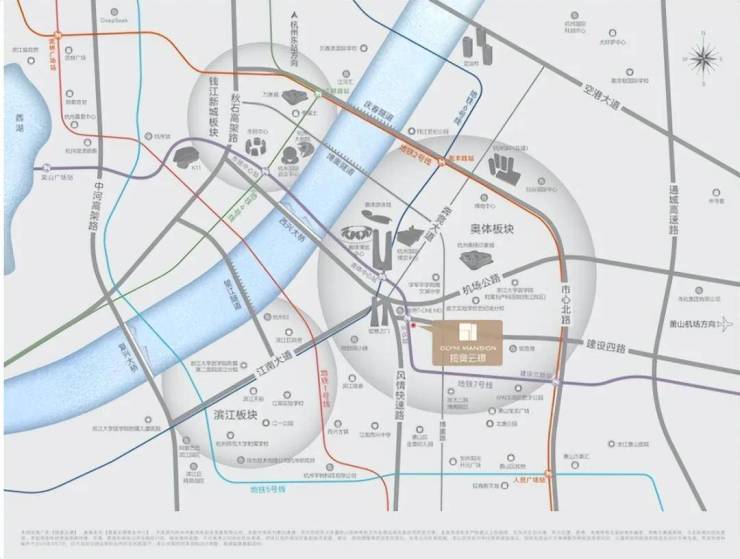 西侧200米为风情大道,快速连接滨江区政府、钱江新城等城市枢纽,形成“三横两纵”立体交通网。