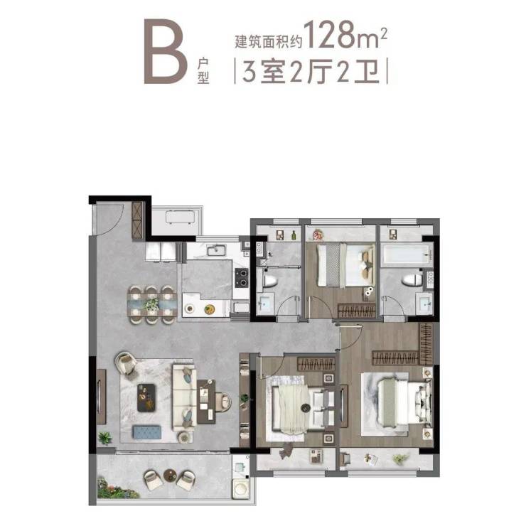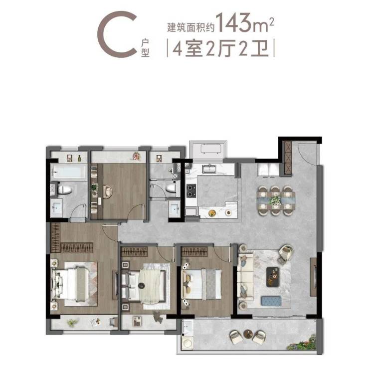 户型面积:约105㎡、约128㎡、约143㎡、约169㎡四个户型。
