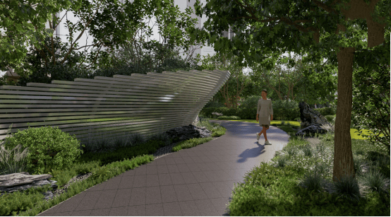 社区内部,是一条长约20米连绵起伏的造景墙和景观夹道,兼具仪式感的同时也能一步一景,让业主归家途中心生乐趣。