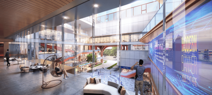 其设计的业态也极为丰富,涵盖游泳馆、网球馆、室内篮球场、基层社区中心、生鲜超市、社区图书馆、乒乓球馆等多种娱乐生活空间。