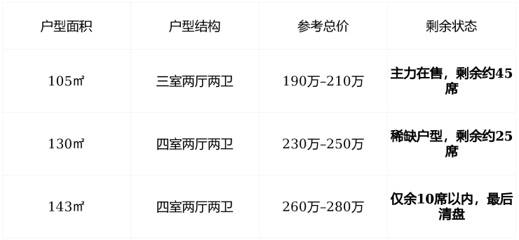 📌 剩余房源不足80套 ,主力户型为105㎡三房与130㎡四房, 143㎡大四房已近售罄清盘在即,议价空间极小