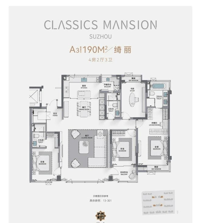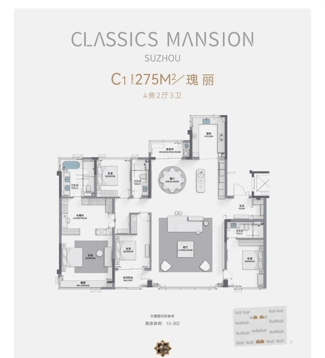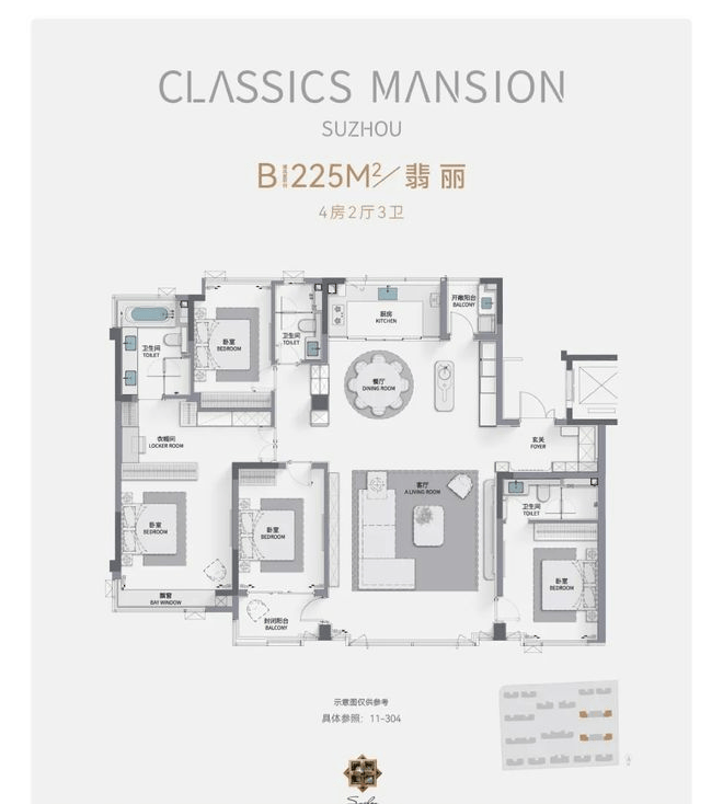户型设计:主力户型为建面190㎡、225㎡、275㎡四居室,采用明厨明卫、客厅朝南的经典布局,275㎡户型更配备独立衣帽间