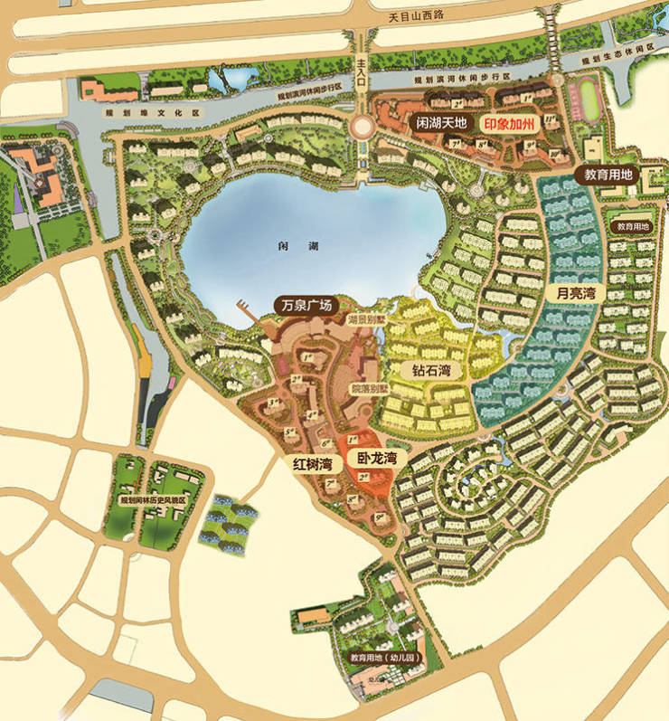 东海闲湖城是由杭州东海春房地产开发有限公司开发的超大型低密社区,总占地约1200亩,总建筑面积100万平方米,容积率0.8-1.2,绿化率40%。项目位于杭州市余杭区闲林街道天目山西路277号,紧邻20万平方米闲湖水体,形成"一湖三岛"生态格局