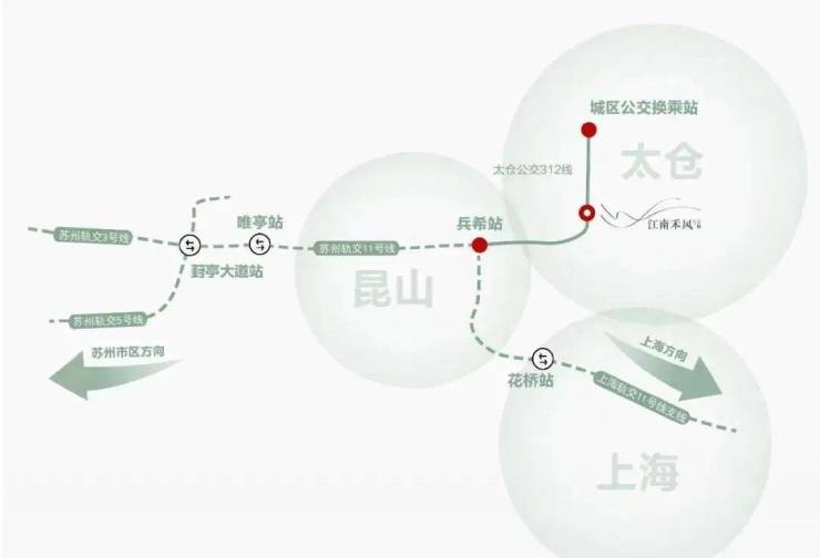 项目邻靠前进路、胜泾路、烟沪线(204国道),便捷接入两高(京沪/沈海高速),同频太仓“5+1”轨道交通网络(建设中),公交路线312路自江南禾风站,向西链接苏州轨交11号线,向东至科教新城客运站换乘60路,102路,112路,128路,以多维立体交通便捷出行长三角。(资料来源于太仓发布官微)