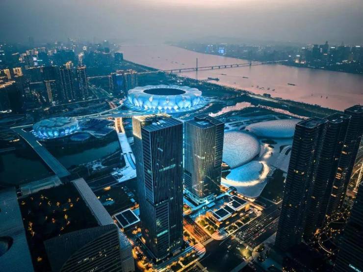 项目选址钱塘江南岸城市中轴线,紧挨着奥体博览城与钱江新城这两大城市封面区域,拥有国际赛事场馆集群以及世界级城市地标景观体系。其建筑规划深度融合城市资源,七甲河生态走廊和城市天际线形成多维景观界面。