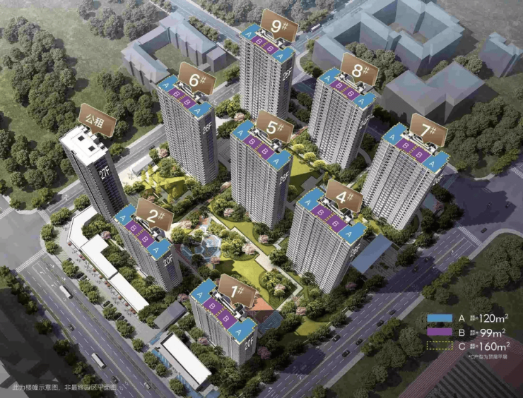 项目规模:总建筑面积约14.35万平方米,规划9栋高层住宅(20-26层)及1栋公租房,共918户。
