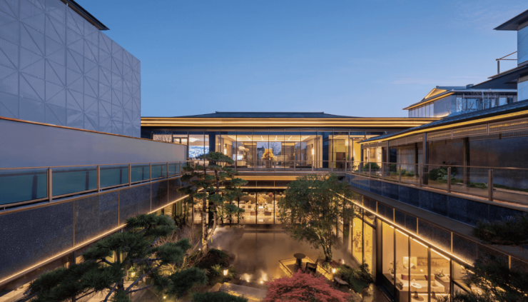 建筑立面汲取宋风歇山顶、重檐等形制,结合现代横向线条与挑檐,形成“屋檐、屋身、台基”三段式东方美学,简约中隐含贵气。
