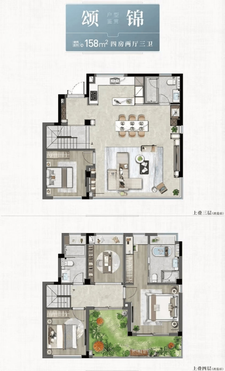 毛坯叠墅:面积段为158-183㎡,总价约430-600万元。上叠带L型露台,下叠附赠约210㎡庭院,得房率高达85%-86%,实际使用空间远超建筑面积。