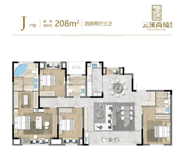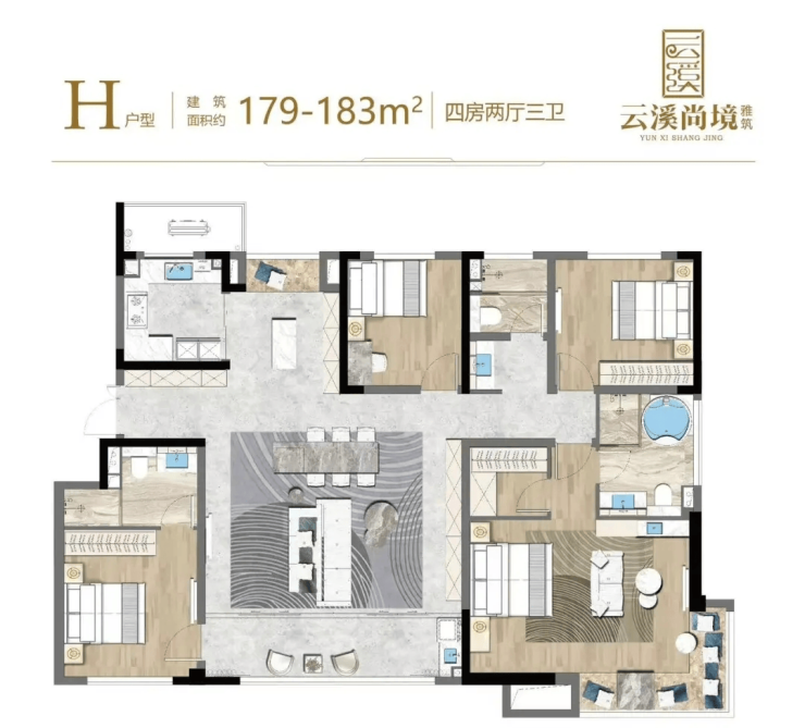 建面179-208㎡奢阔四居:总价300-380万,分布于7#、5#、4#、3#楼。近15.7米超大面宽,配置中西双厨设计,双套房和3个卫生间,满足三代同堂居住需求