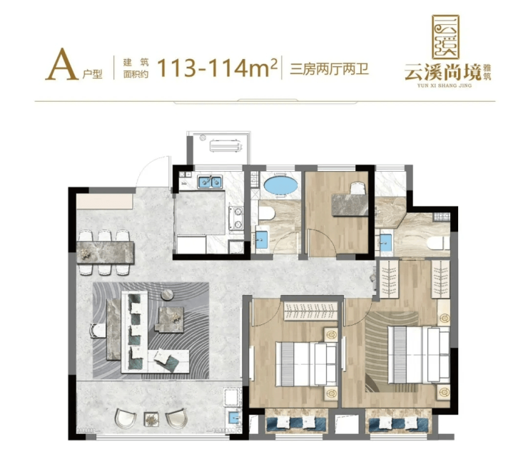 建面114㎡三居:总价145-170万,分布于12#、10#、9#楼,1梯1户设计,层高3.15米,总楼层13F。该户型近12米大面宽,客餐厅一体化空间近5.5米面宽,配备独立主卧套和奢阔沐光全景阳台