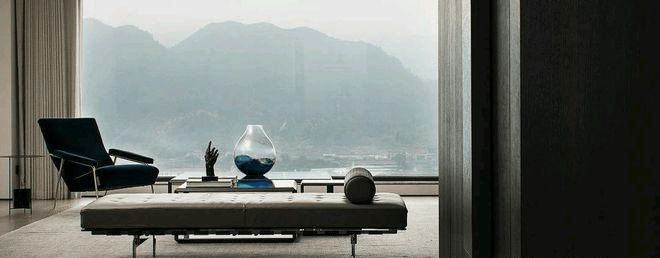 山峰在晨曦的朦胧中,轮廓若隐若现,让人无法抗拒它的美丽.而室内简约的设计风格,与窗外的美景相得益彰,让人无法抗拒这样的组合.