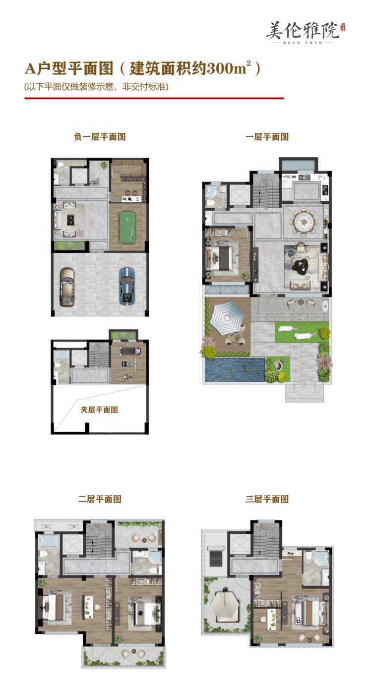 350㎡户型:面宽10.65米,进深9.4米,庭院面积100㎡起,总价约500万