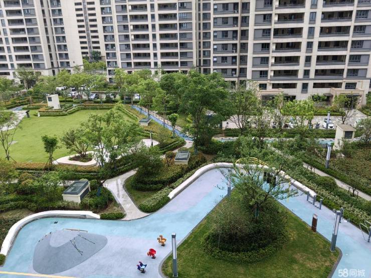 小区内设1千米健身跑道、儿童游乐设施及水系景观