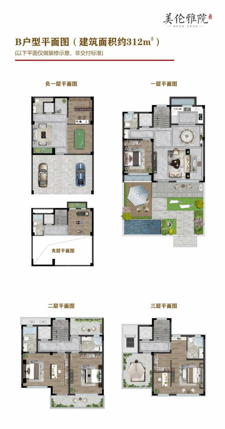 所有户型均采用"前庭后院"布局,地下层高5.8米可灵活改造为影音室、酒窖或健身房,二层设南北双露台,三层配备15㎡瞰景露台,实现"有天有地"的墅居体验