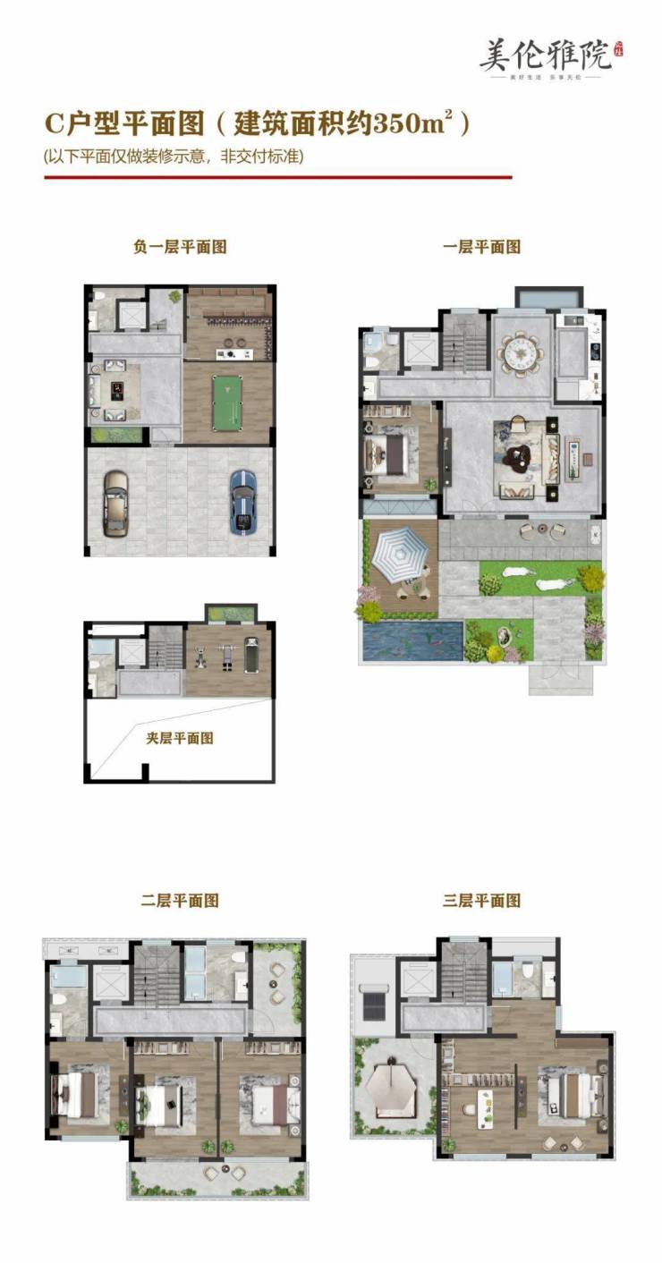 350㎡户型:面宽10.65米,进深9.4米,庭院面积100㎡起,总价约500万