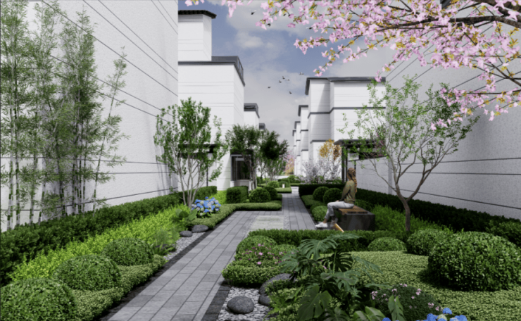 宅间花园以"四季有景"为原则,种植樱花、紫薇、红枫等季节性植物