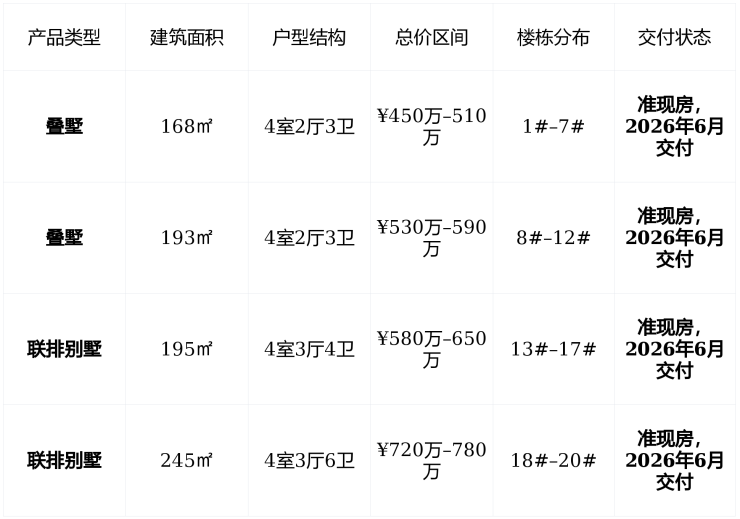 剩余房源 :截至2026年1月, 剩余约23席 ,主力叠墅193㎡、联排195㎡已接近售罄