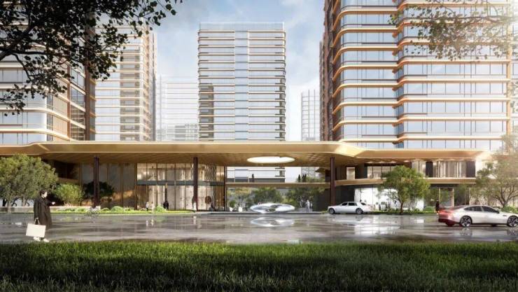 整体的抬高,让约70米宽的鎏金天幕大门头高度达到了约9米,显得格外气势非凡。天桥连接了会客厅、架空层和内部园林。