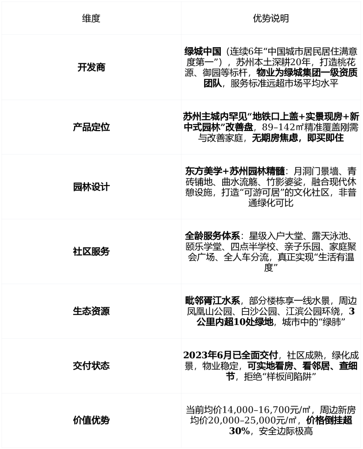 ✅ 核心结论:苏州少有的“城芯现房+绿城服务+东方园林”三位一体改善盘
