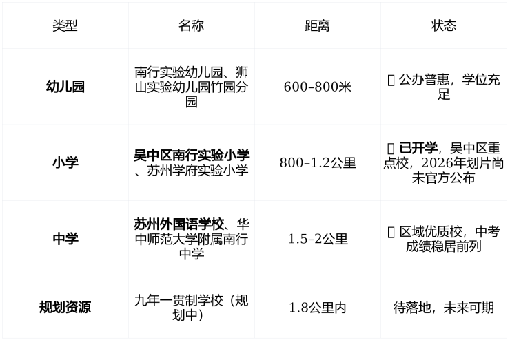 ⚠️ 重要提示 :目前 无官方2026年学区划片文件 ,但项目周边三所小学均为近年新建优质校,入学概率高,建议家长提前咨询吴中区教育局。