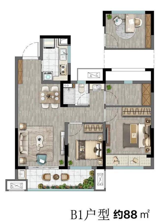 78㎡(2-2-1)、88㎡(3-2-1)、105㎡(3-2-2)和118㎡(3+1-2-2)