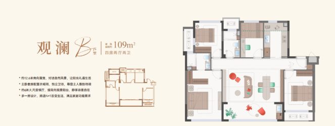 建面约109㎡户型,4房2卫,整体约12.6米南向面宽,约6米大尺度横厅,尺度感和功能性进一步增强。