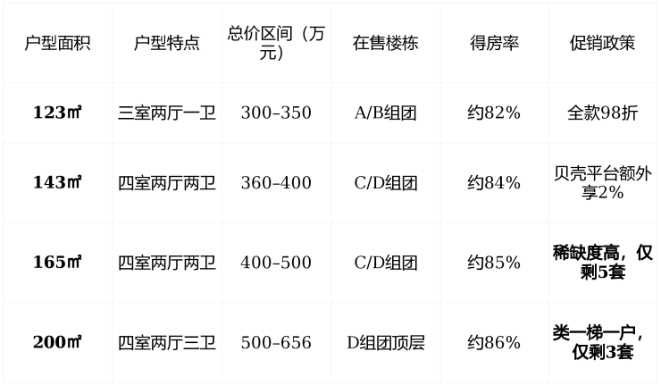 购房提示 :200㎡大平层为“ 最后的稀缺资源 ”,建议优先锁定南向湖景视野房源;165㎡户型因户型方正、功能齐全,成为改善家庭首选,剩余房源不足10套。
