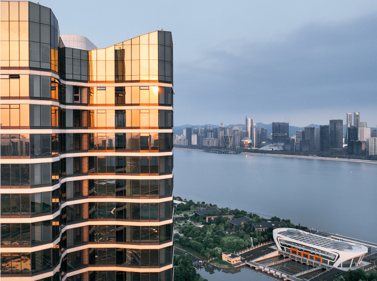 鎏金玻璃幕墙立面 :以杭州市花“桂花”为灵感,建筑外立面采用鎏金玻璃与黑金石材拼接,形成钱江世纪城新地标。