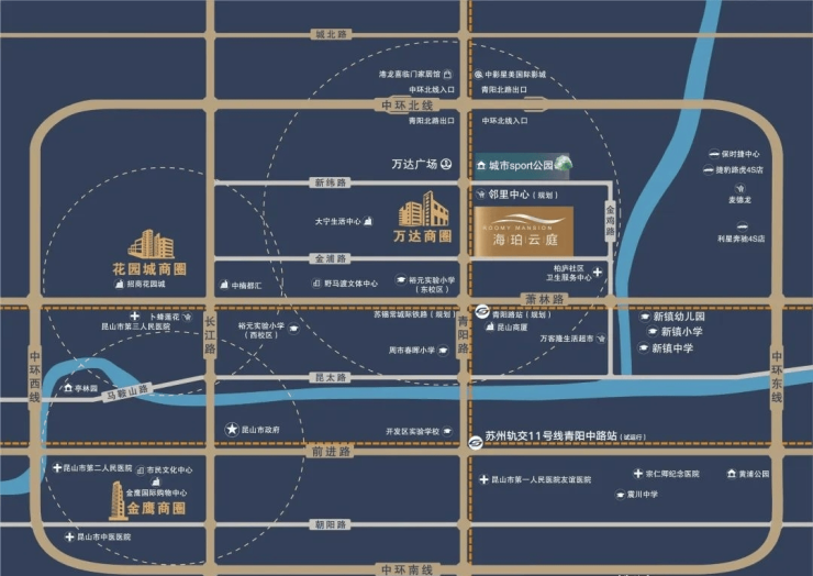 主干道:紧邻青阳北路(双向六车道)、萧林路、中环入口,快速通达昆山全城