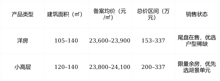 瞰景小高层:建面约120–140㎡,12层,部分楼栋直面天镜湖,视野开阔。