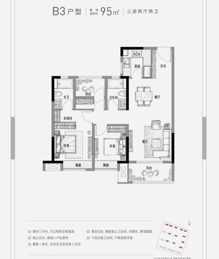 95㎡户型实现“小户型大空间”体验,功能分区合理,双卫配置提升生活便利性。