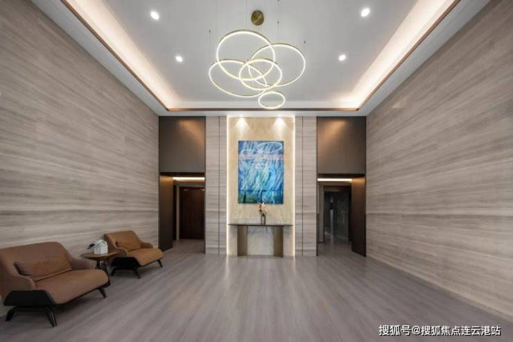 公区设计上,览月阁同样是高奢酒店风。地上单元门厅高挑大气,艺术吊顶+超大现代艺术灯+大幅岩板,加上各类材料的艺术化运用,同步星级酒店的高级生活体验。
