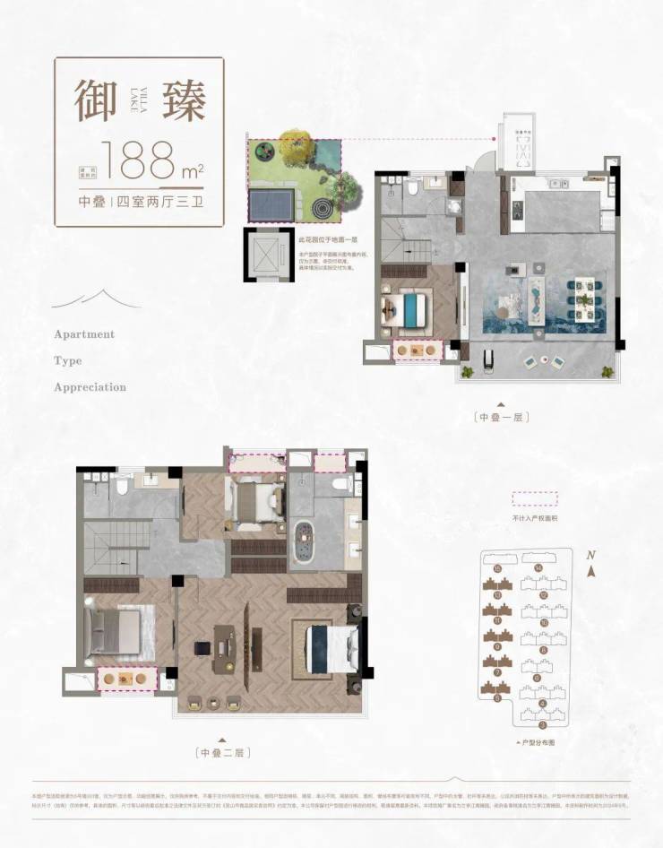 (3#5#7#9#11#13#小叠)中下叠建面:188平,四房两厅三卫(下叠送南向花园35平,中叠送北向花园15平)