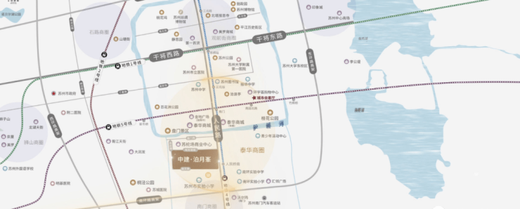 与占位和大视野相匹配的,是各类资源的汇聚,中建泊月峯所在的南门既是苏州的老牌富人区,也是焕新升级的综合性现代文、商、旅融合商圈,集合了如泰华商城、苏纶场商业中心,金地广场(待开),竹辉环宇荟等高端配套业态。