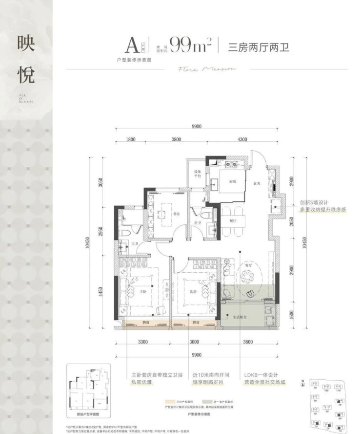 99㎡三房两卫:三开间朝南,动静分区