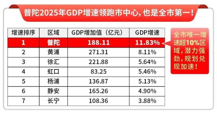 为何环宇玖章能创下现象级热度、让购房者毫不犹豫落位?核心源于市场对真如多年规划全面兑现的高度认可,以及对普陀未来发展的坚定信心。首先,2025年普陀GDP增速领跑市中心、位列全市第一!全市平均增速约5%,普陀以11.83%一骑绝尘,是全市唯一增速破10%的区域。强劲数据印证普陀正进入价值爆发期,早年布局的产业与城建,如今全面进入“收获期”,发展后劲十足。